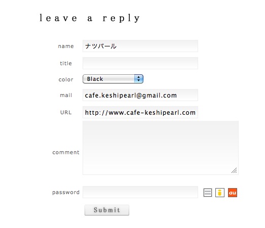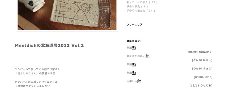 ブログコメント機能について Category:ケシパール日記 Date:2013年11月22日 こんばんは。タツパール&ナツパールです。今日はブログのコメント機能についてのお知らせとお詫びです。といいますのも、今まで頂いていたコメントの一部に気がついておりませんでした!本当にすみません!コメントの書き方には2通りあって、 各記事を表示させたときに出るコメント欄(上図)から記入すると、… 上の画像のようにコメントが表示されます。こちらは全て確認し、返信しております。問題はもうひとつの方。 ブログ記事に拍手した際に頂けるコメントです。実はこちらから頂いておりましたコメントはつい先日まで、チェック出来ていませんでした!実は最近、ブログのデザインを変更しようと色々いじってたら、「拍手コメント一覧」という内容の管理画面が…。そこにはたっくさんのコメントが並んでいて、もう、雷に打たれたようなショックで二人とも固まってしまいました。その後、ひとつひとつコメントを読ませていただきました。オープンして間もない頃から、つい最近に至るまで、たくさんの方々に応援して頂いていることを改めて痛感しました。感謝の気持ちで一杯なのですが、こちらの拍手コメント、それぞれに返信する機能がありません。今更と途方にくれつつ、それぞれの方々にお返事をこの場で差し上げたいと思います。では順不同ですが…/////////////>らぶぽめさんオープン間もないケシパールへのご来店ありがとうございました。二年半前の月日で、とても進化したケシパール。またいらして頂けたら、嬉しいです。>ツイ女さん eさん ナミコさん かかしさん>ちゃあさん MKさん さくらさん nonさん>その他名無しの皆様ケシパールを気に入って頂けて大変うれしいです。コメントの一言ずつが、ずっしり私たちの心に響き、明日からも皆様にとって素敵なカフェになれるようもっともっとケシパールを磨いていきたいです。>t2yさんいつも応援して頂いてありがとうございます。また近くにお越しの際は寄っていって下さい!今度はゆっくり話せる時間があるといいですね。>チャンさんご来店前にコメント頂いていたんですね。お忍びでご来店のはずが、きっちり自己紹介して下さいましたね(笑)父、母がいつもご迷惑をおかけしてます。>ろんさん もえみさん かんちゃんさんコメント頂いてからしばらくたってしまいました。ご来店いただけたでしょうか?期待に応えられたのか、とても気になります。>就活中さん一周年のお祝いコメントありがとうございます。今は社会人さんでしょうか。仕事の息抜きに是非ご来店くださいね。>岡本さん先日、大阪でのしおりさん器展に伺いました。全部素敵で、ケシパールの器を全てしおりさんの作品にしたいくらいです。またお会い出来る日を楽しみにしております。>macoさん2周年の際はありがとうございました!そして今日もご来店ありがとうございます♩いつもありがとうございます。私たち、macoさんの笑顔に癒されています。>かなちん♩さんベベチオさんのライブ参加者でケシパールに前からいらしてくださってるのは、実はかなちん♩さんだけだったかもしれないです(笑)なので、一番贅沢にライブを味わえたんじゃないかと思います!あ、たいらさんも常連さんでしたね♩>mizueさんこちらこそ先日は素敵な式にお招き頂いて、ありがとうございました。神戸は遠いですが、近くに来ることがあれば、是非寄ってくださいね☆またお会いできるのを楽しみにしています。>えりか & えりかママさん熱い励ましの言葉、ありがとうございます♡お互い頑張りましょう!!こちらも、遠くながら応援しています☆>ちえさん短い間でしたが、東京ではお世話になりました。あの頃が遠い昔のように感じます。神戸には来ないとか言わずに、是非来て下さーい!!!!!いつでもお待ちしてます♡/////////////今後は拍手コメントに関してもちゃんと返事出来る態勢にします☆そしてちらっと触れましたが、ブログのデザインをもうすぐ変更します。お楽しみに♩ [9回]PR