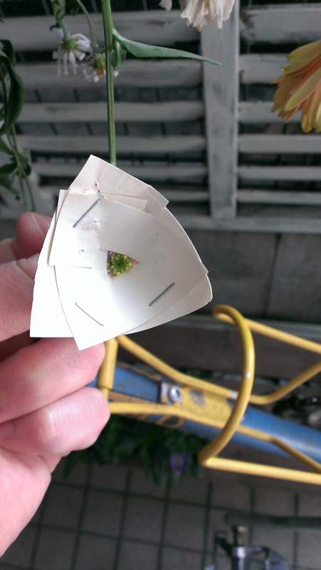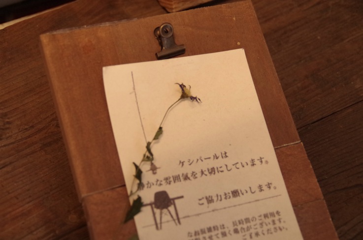 しばしの休息〜ミヤコワスレ〜 Category:DIYカフェ Date:2014年06月12日 こんばんは。タツパールです。先週木曜日から営業を再開しました。長いことお休みを頂いていたにも関わらず、この一週間、ビックリするくらいたくさんのお客様がいらして下さりビックリしました(!_!)ありがとうございます。約一ヶ月のお休み。ツイッター上では「ケシパール改装中」みたいな謎の情報が散見されてビックリしてましたが、そんなに変わってません(笑)では、一体何をしてたのかというブログは、またのお楽しみ(苦笑)にして、今回はお休み前の話。以前、ほったらかしにしていた、ケシパール謎のオブジェ製作ブログの続きになります。チーズケーキ、珈琲、ひとときの休息。ケシパールのキャッチコピー(?)を表す何かを作ろう。そんなオブジェを作っていました。 その、「ひとときの休息」を担うのがこのお花。 ミヤコワスレ。鎌倉時代に承久の乱で佐渡に流された、順徳天皇が名付けたとされる野菊の一種。気品ある美しいこの花を見ていると心が落ち着いて、しばらくの間だけでも都を忘れさせてくれる、というのが名前の由来。少し悲しいけど、素敵な名前ですね。ケシパールにいる間は、街で過ごす日々の喧噪を少しばかり忘れてゆっくりしてもらえたらいいなあ、という想いを重ねて、このお花を選びました。花言葉のひとつは「しばしの憩い」だそうです。5月に咲くということで、開花待ちだったこのお花。さてさて、飾ると決めても、どう飾ればいいのか。考えた末、ドライフラワーに。摘み取って、風通しの良い日陰に…。 (写真中央付近)ついでに、3周年で頂いたお花たちもいっしょに。で、数日後。しわしわのもじゃもじゃした何かになりました。 もじゃーん…。調べてみると、そんなに簡単にドライフラワーにできるような花じゃなさそうで…。でも、男にはやらなきゃいけないときがある。それは、今だ。3分もの試行錯誤の末、花弁がクルクルにならないよう、特別アイテムを開発。そして新しく咲いた花を摘み… 図1-1「花びらまっすぐにな〜る」装着中 図1-2「花びらまっすぐにな〜る」装着完了もう、コレはすごいに違いない。ドライフラワー界に革命が起こる。そんな確信を抱きながら、更に数日後、ご開帳。 なんだこれ。ノー革命ですね。若干まっすぐになりましたが、とてもかよわく儚い仕上がりに。なにはともあれ、死力を尽くして作り上げたミヤコワスレのドライフラワー。いとしさとせつなさと、心細さ(少なくとも一年は持って欲しい…)を抱えながらも、過ちを恐れずに進んだ結果だと思って、ここに飾ります。 花言葉は「しばしの憩い」合言葉は"DO NOT TOUCH"ミヤコワスレでした。 [10回]PR