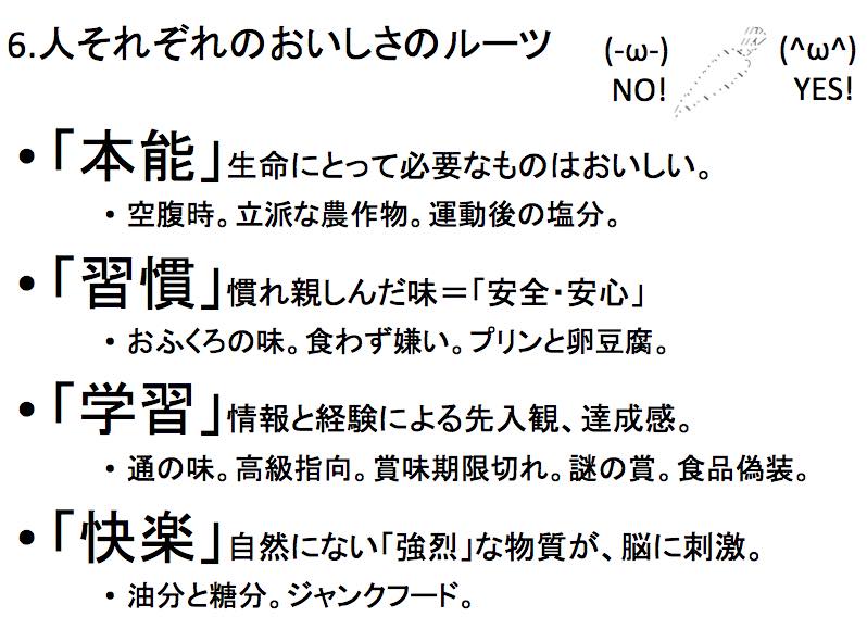 臨時休業のお知らせと、バレンタインと、会議の続き Category:ケシパール日記 Date:2016年01月31日 こんにちは。 バレンタインでもそわそわしないタツパールです。 昼ブログです。 ここのところ、 ケシパールではチョコ系チーズケーキを2種用意してます。 特に週替りの「ラムレーズンショコラのチーズスフレ」はやばいです。 スフレならではのしっとりホロリとした質感と、 生チョコのようなシルキーな口どけが一緒に味わえる、なんともめずらしい食感。 生地のココア、混ぜ込んだ刻みチョコ、そして自家製ラムレーズンが、 ちょっとした時間差で、あとからあとから味と香りを供給してきて、 いつ飲み込めばいいのか分からないほどの、リッチな一口に興奮します(今食べながら書いてます。なので、今リアルタイムで興奮してます。) すみません、こうふんしました(ふがふが) まずは臨時休業のお知らせ。 前回ブログでもお知らせしておりますが、 2/15(月)と2/18(木)に臨時休業を頂きます。 定休日と合わせて、 2/15~18の期間がお休みとなりますので、 ご来店の際はお気をつけ下さい。 前回の続き、ケシ会議~後編~です。 いつにも増して内容が固いです。 歳かしら。メイツたちと働くようになって、体面を気にしてるのかしら。 というわけで、寝付けない夜に読むのがオススメ。 会議後半は私、タツパールから。 偉そうにふんぞり返ってますね(失笑) 顔色が、背後の古びた木箱と同じ色ですね(苦笑) ケシ会議では、 「おいしいとは何ぞや」について、お話しさせてもらいました。 脳科学、認知神経学、心理学、社会学… いろんな分野にまたがっていて、とても面白い分野です。 それぞれの人が違った「おいしい」を持っているのは自然なこと。 「どうして違うのか?」を学術的な側面から簡単に勉強し、 ケシパールでの接客の一助になるかと思い、メイツたちにも紹介しました。 資料の一例。 「おいしい」ということば。 "①個人の好み"が強く働く感覚の表現であり、 "②社会的な価値"を伴う一般的な評価にもなってしまうことば。 ここからは勉強から得た僕の持論ですが、 自己の体験による"①個人の好み"が確立されていないと、 周囲の情報である"②社会的な価値"に流されてしまいやすくなる。 場合によって②は、巧妙な広告(ex.ステマ)だったり、嘘の情報(ex.食品偽装)が混ざっていたりします。 情報に溢れかえった今の社会で「おいしい」を楽しむためには、 ①の感覚を磨くことが大事だと考えます。 料理を食べた→「おいしい!」 ・それは本当においしい? 情報、雰囲気、気分に踊らされてない? ・それはどうおいしい? 素材がいい?調理がよい?味?食感?香り? ・それはなぜおいしい? 私の好み?他の人なら?一般的には? 上の質問は、分析と区別をするための第一歩。 「味覚の記憶力」が料理人には大事だと耳にします。 そのときどきの「おいしい」がどういうふうに「おいしかった」のか、 (通常は言葉で)分析し、区別して整理しないことには記憶にとどめられません。 「おいしい体験」を深く心と記憶に留め、蓄積する。 その蓄積を足場にして、成長があるのだと思います。 料理が大好きな人や、(本当に)グルメな人は質問の答えがスラスラ思い描けるのではないかと考えます。 ちなみにナツパールはこの点、神掛かった記憶力を発揮します。 例えば、旅行に行った時の思い出を話してみると、 「誰が何を食べたか」を事細かに憶えています。 逆に旅行中の他のことは 「何を食べた場所なのか」 「何を食べに行く途中なのか」 というヒントがないと思い出してくれません…。 それはそれでどうなのか・・・。 続きましてナツパール。 ナツパールは「表現すること」をプレゼン。 勝手に僕が適当に代弁します。 "表現することは内なる自分の想いを「表」に「現す」ということ。 発信者 VS 受容者の「伝わってナンボ」の厳しい世界。" "自分の発したいもの、発したもので、 気まぐれな受容者に対して一瞬の「関心」を与えることが出来るかどうか。" まず、詩人の方が書いたエッセイからの引用を紹介。 ケシパールでの接客の難しさを、端的に言い表してくれているかのよう。 ケシパールにおいて、 表現することはとても大切なんです。 最近よくナツパールと話に挙がるのが、ケシパールの存在意義。 僕たちは「笑顔で笑顔をつくること」を生業とするために、 ケシパールというカフェを始めました。 なので、極論を言えば、むちゃくちゃこだわっている 「チーズケーキ」も「珈琲」も「静かな空間」も 正直なところ、他の形でも良いんです。 代わりが効かない命題である 「私たちの笑顔で、お客さまの笑顔をつくること」を達成するため、 「表現する力」を磨くのはとても大事なのです。 というわけで、 メイツたちにも演習として、 次のお客さまが入店した場合の、 「こんにちは」の言い方を練習してもらいました。 課題1 課題2 課題3 もはや無茶振りです。 そんなこんなで、 表現することの難しさ、