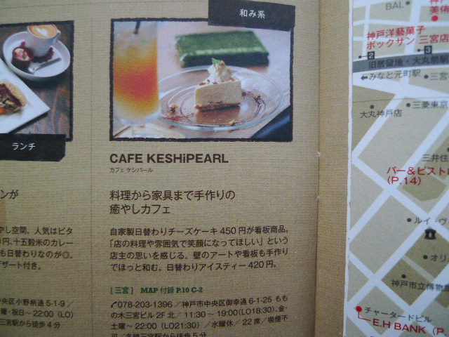 神戸カフェブック2012 Category:ケシパール日記 Date:2011年09月18日 こんばんわ。 ナツパールです。 今日はこちらをご紹介〜 成美堂出版の「神戸カフェブック2012」 こちらに、 カフェケシパールを掲載していただきました!!! 神戸にカフェを開いて 約半年。 カフェケシパール初の雑誌掲載です♡ 掲載ページは付録ページなので、 小さい1コマですが、 本屋さんで雑誌を目にした時、 とても感動的でした。 やっと神戸のカフェに仲間入りしたんだと、 しみじみ。 これからも頑張ります♡ [7回]PR