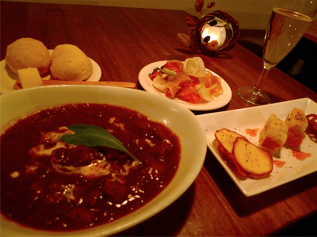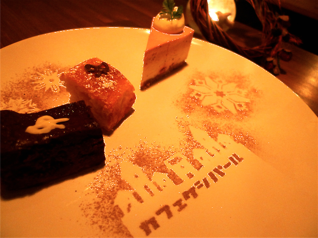 クリスマスディナー2011@カフェケシパール Category:ケシパール日記 Date:2011年12月28日 こんにちは。 ナツパールです。 いよいよ年も暮れですね。 今年も残すところ後3日になりました。 今年のことは今年のうちにということで、 クリスマスディナーのお料理を紹介します。 一度に並べてみました。 右手前から反時計回りに。 •2種のケークサレ 「スモークサーモンと薩摩芋」 「蓮根とカッテージチーズ」 →ケークサレは、塩味のお惣菜ケーキです。キッシュみたいなイメージです。 •カブと生ハムのサラダ →カブのシャキシャキした食感の楽しいサラダです。色鮮やかに仕上げました。 •お豆腐スコーン →メインと一緒にお出ししたお豆腐のスコーン。ふんわりしっとりした食感と お豆腐の優しい甘さが美味しい、ヘルシーなスコーン。 •ケシパール特製牛すね肉のビーフシチュー →牛すね肉がとろとろになるまで、何時間もかけて煮込みました。 とろりと濃厚なシチュー。牛すね肉がほろりと崩れます。 そしてデザートをコーヒーor紅茶とお出ししました。 •ラズベリーレアチーズケーキ →ラズベリーをそのまま混ぜ込んだ生地と、ラズベリーピューレを混ぜ込んだ ピンク色の生地の2層。女の子に人気のケーキです。 •レモンジンジャーケーキ →新生姜とレモンをたっぷり生地に焼き込んだ、爽やかなケーキです。 •ビターチョコ&エスプレッソのベイクドチーズケーキ →ケシパール自慢のエスプレッソ入りチーズケーキ。 コーヒー好きの為の、濃厚で滑らかな生チョコのようなチーズケーキです。 クリスマスが終わるとあっという間に今年が終わっていきますね。 ケシパールは30日まで営業しておりますので、 是非是非お立ち寄り下さい☆ 29(木)通常営業 30(金)通常営業(夜カフェ) 31(土)お休み 1(日)お休み 2(月)お休み 3(火)お休み 4(水)定休日 5(木)通常営業 6(金)通常営業(夜カフェ) では☆ [3回]PR